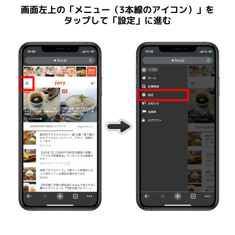 画面左上の「メニュー(3本線のアイコン)」をタップして「設定」に進む。