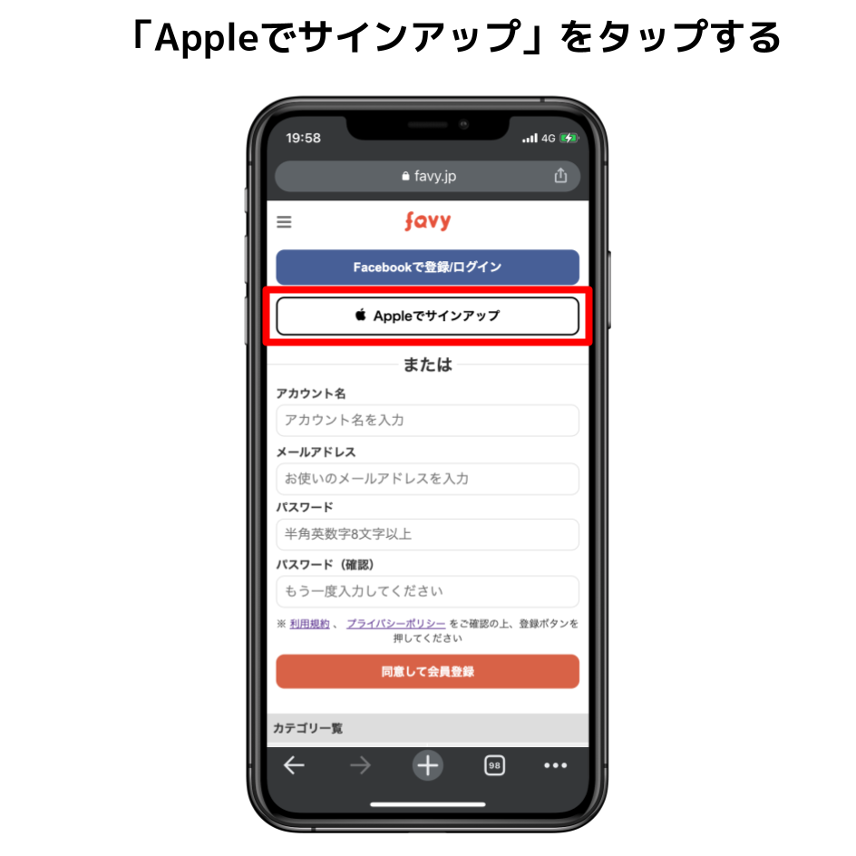 favy個人会員専用の新規登録ぺージにアクセスする。