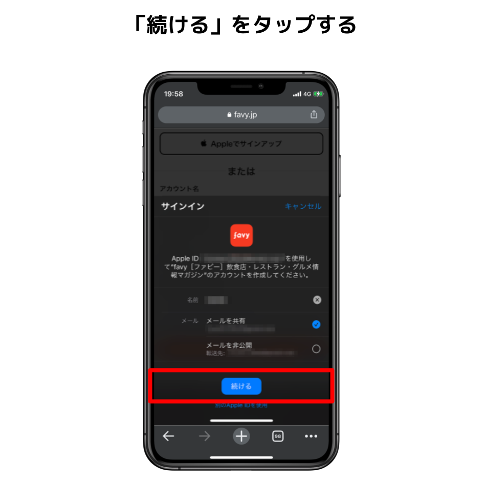 「Appleでサインアップ」をタップする。