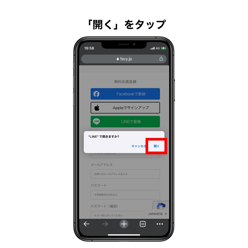 「“LINE”で開きますか?」の表示を「開く」をタップ