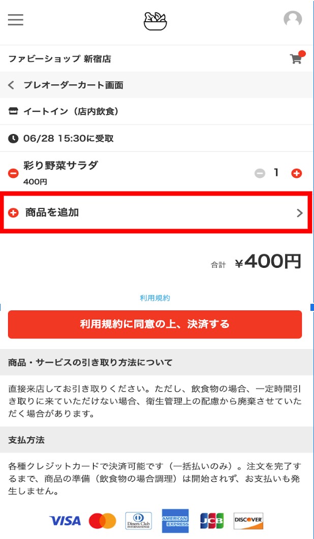 受取希望時間選択後、下記画面にて商品の追加が可能となります。
