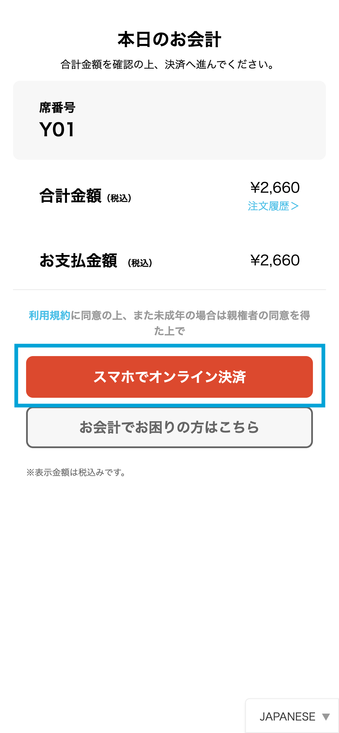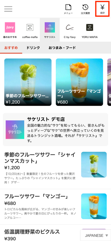 お会計の際は、右上の「会計」アイコンを選択してください。