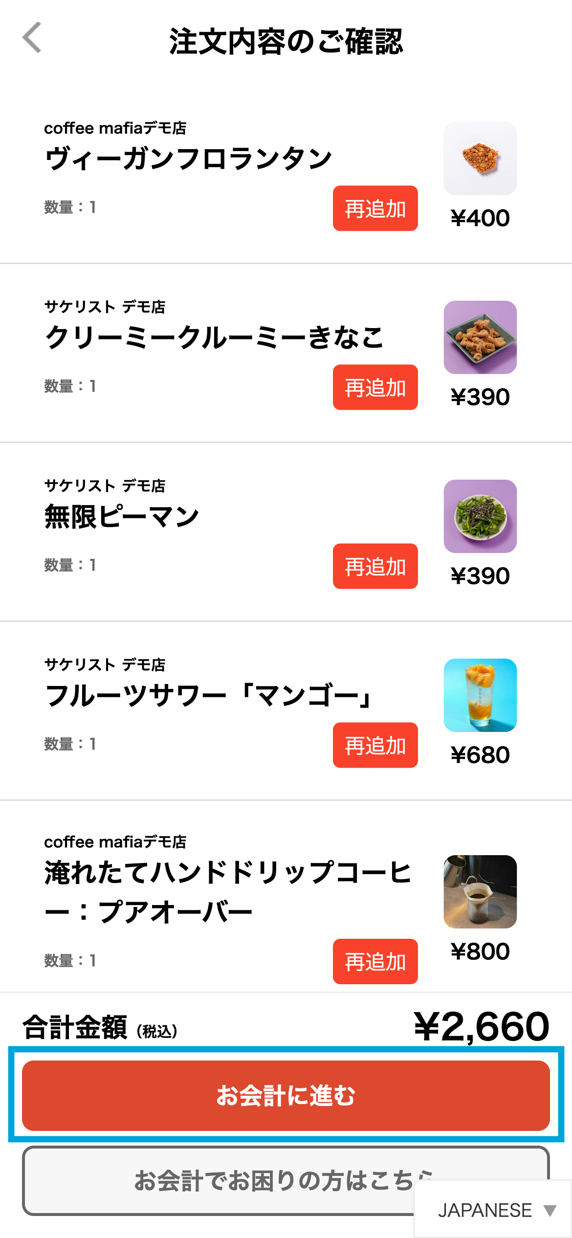 注文内容を確認し、「お会計に進む」を選択してください。