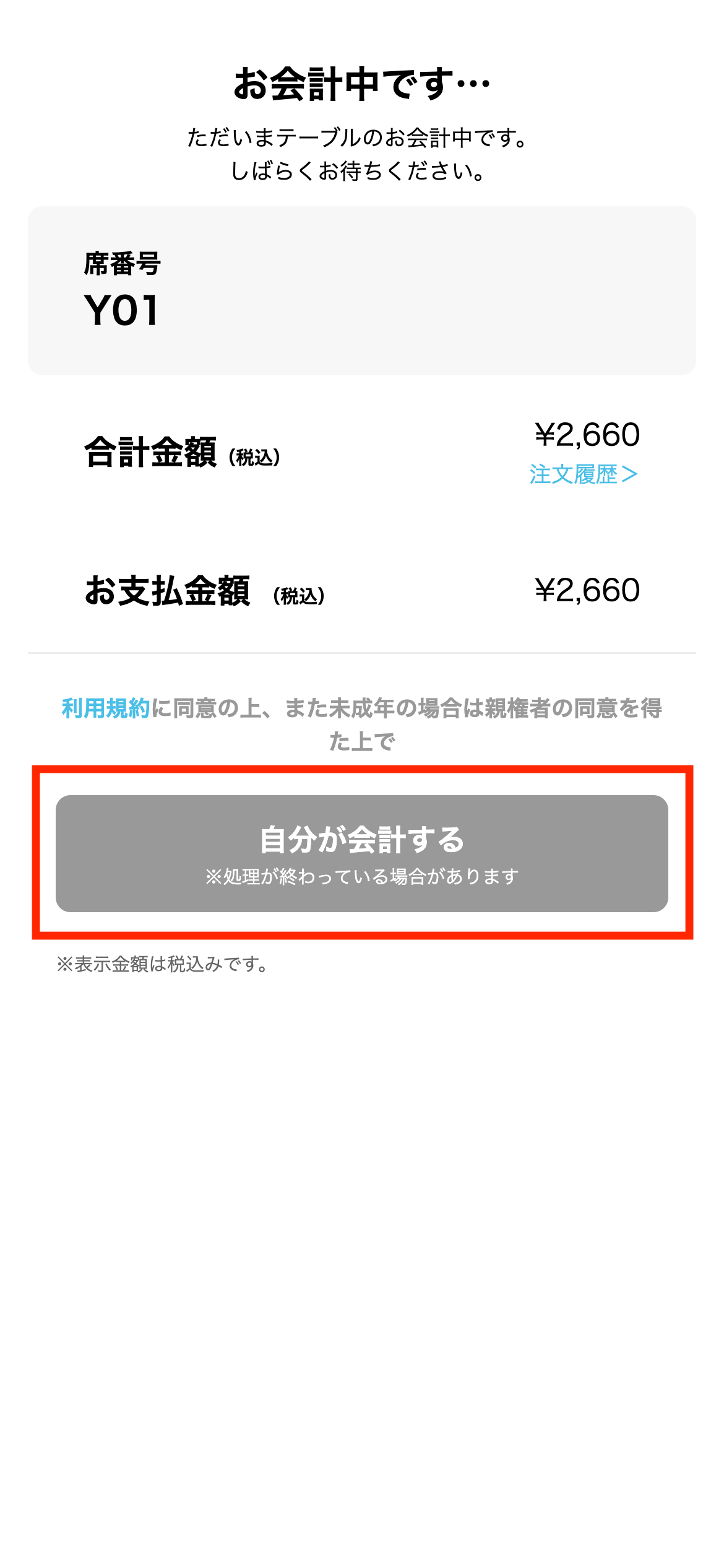 同テーブル内の別の方がお会計に進んだ場合は以下の画面が表示されます。