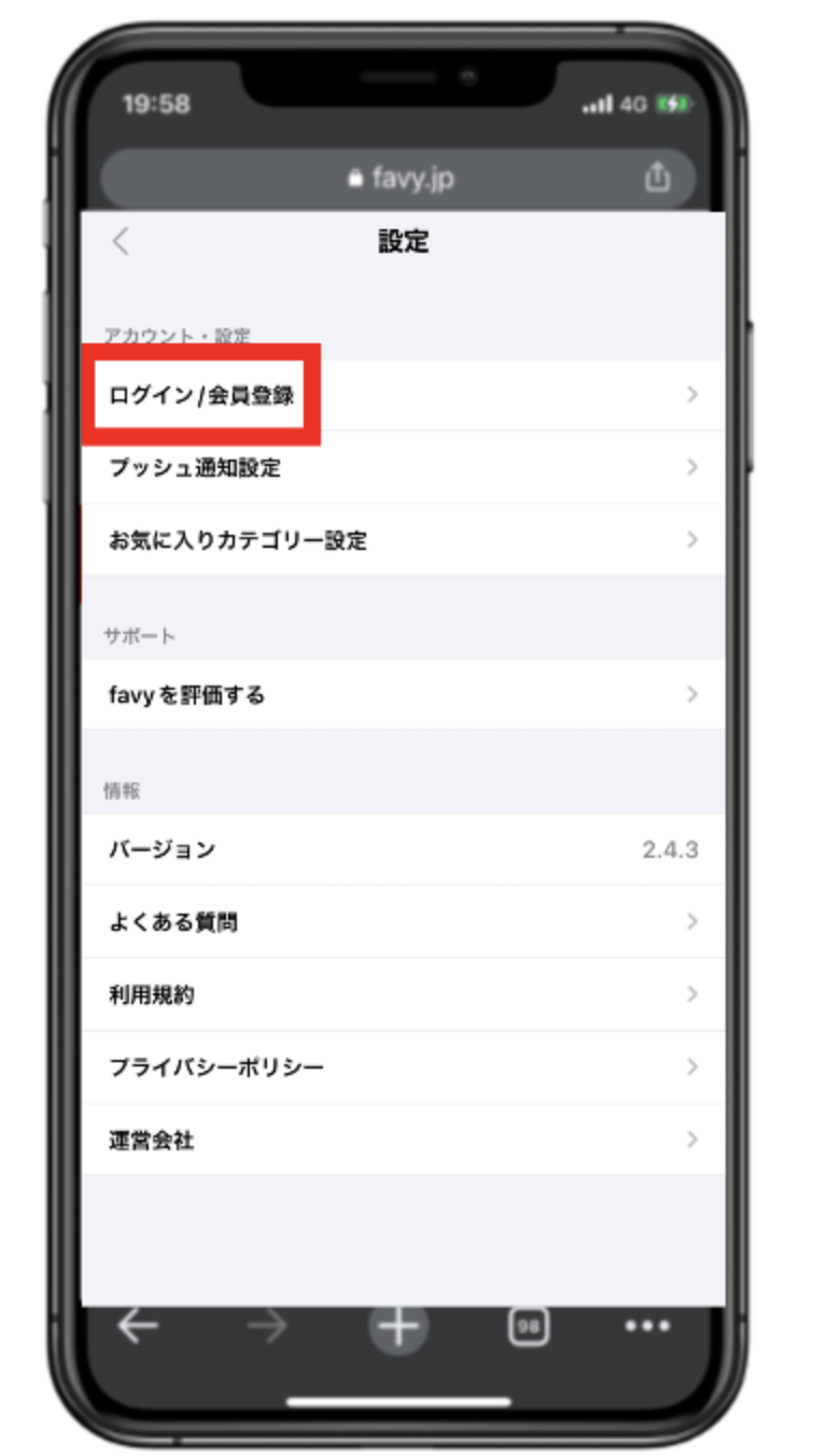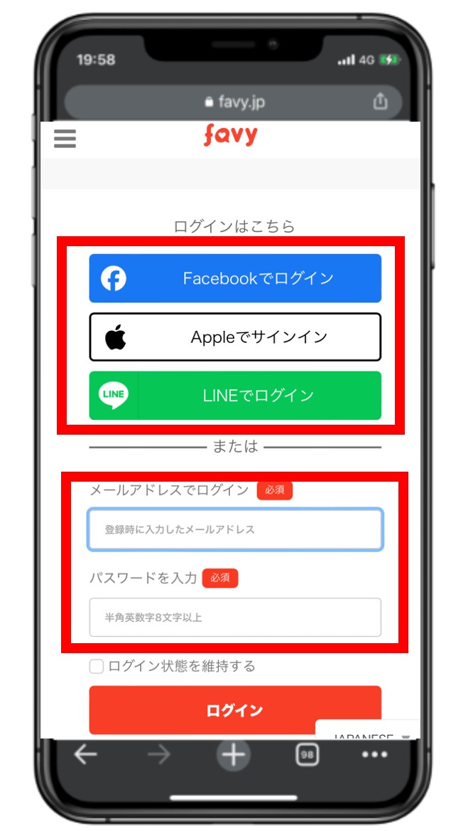 ・LINEでログイン :LINEに設定されているログイン情報が、favyのログイン情報となります。