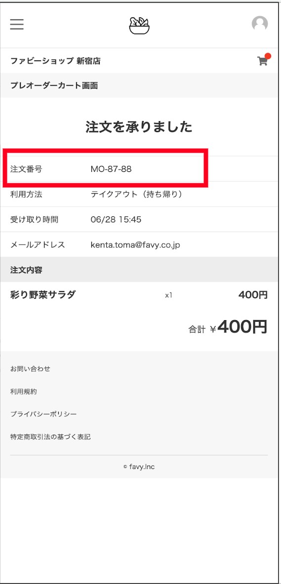 ご注文完了後、店舗へ直接ご来店いただき、ご注文完了画面に記載の【注文番号】をスタッフへお伝え下さい。