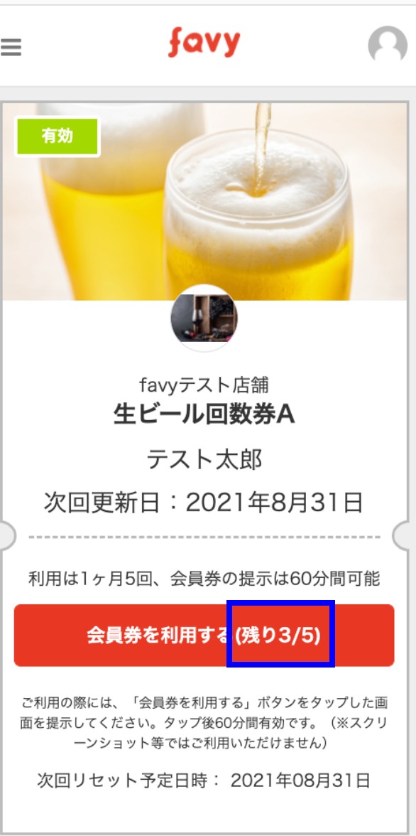 お客様の会員券利用画面にてご確認が可能です。「会員券を利用する」ボタンに表示されております。下記画像の青枠部分ご参照ください。※上記画像の会員券は月に5回ご利用いただける内容となり、残数が3回の場合「3/5」という表記に変わります。