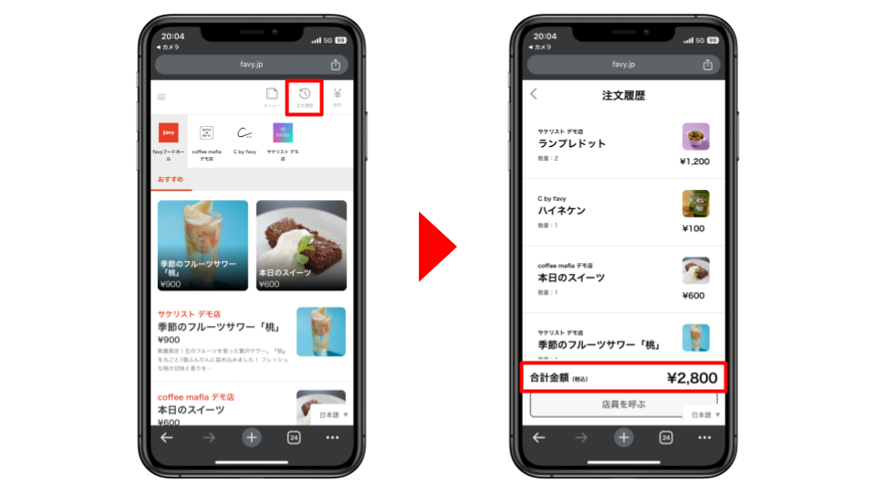 店内にてご飲食中のみ、ご注文ページ右上の「注文履歴」より合計金額をご確認いただくことができます。