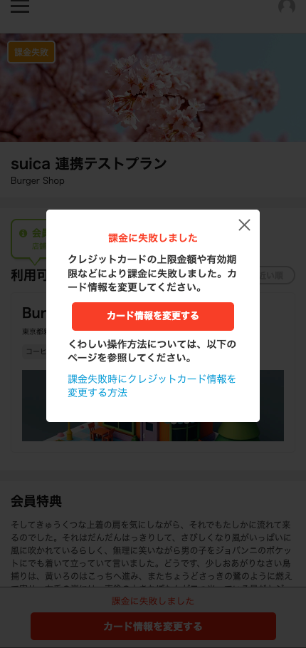登録しているクレジットカードの上限金額に達したかカードの有効期限が切れた場合、課金失敗となります。
