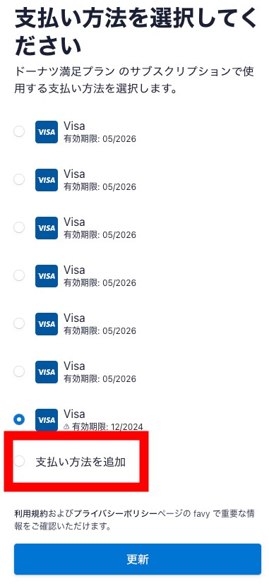 表示された画面にて「支払情報の追加」から新しくクレジットカードの追加が可能です。
