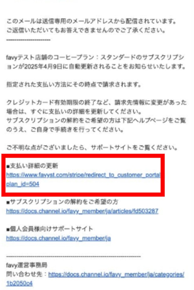 favyサブスクでは、更新1週間前に『[サービス名]のサブスクリプションの更新が近づいています』という件名にて、自動更新前通知を送信しております。